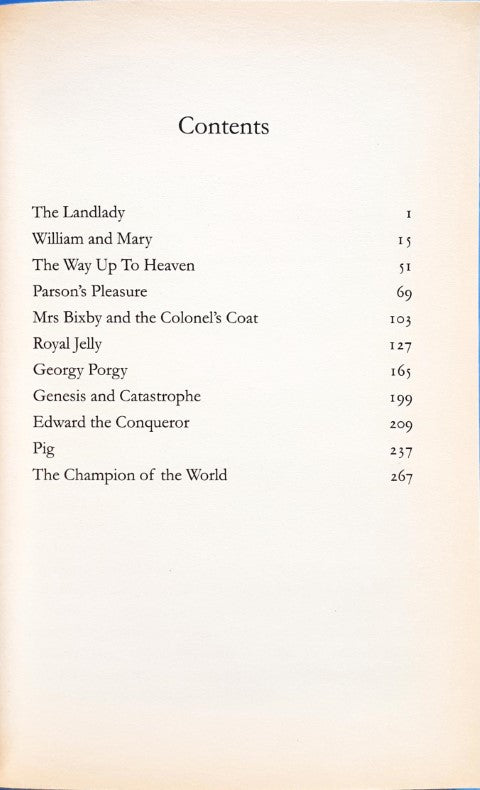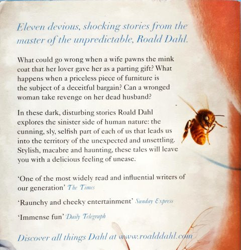 What could go wrong when a wife pawns the mink coat that her lover gave her as a parting gift? What happens when a priceless piece of furniture is the subject of a deceitful bargain? Can a wronged woman take revenge on her dead husband? In these dark, disturbing stories Roald Dahl explores the sinister side of human nature: the cunning, sly, selfish part of each of us that leads us into the territory of the unexpected and unsettling. Stylish, macabre and haunting, these tales will leave you with a delicious feeling of unease. The stories are: "The Landlady", "William and Mary", "The Way Up To Heaven", "Parson's Pleasure", "Mrs Bixby and the Colonel's Coat", "Royal Jelly", "Georgy Porgy", "Genesis and Catastrophe", "Edward the Conqueror", "Pig", and "The Champion of the World".