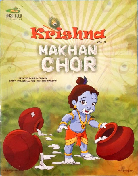 Under auspicious astronomical position, Krishna is born to Devaki and Vasudev. Lord Vishnu himself appears to Devaki and Vasudev, and assures them that it is he who will be born in the form of Krishna. Lord Vishnu instructs Vasudev to take the baby to Gokul, and exchange the baby with the just-born daughter of Yashoda and Nand. Vasudev magically is set free by Lord Vishnu, and is able to escape the prison and carry baby Krishna to Nandlal and Yahsoda at Gokul. On realizing that the baby had escaped, Kansa instructs a witch named Putana, to kill the new born children in the cities, villages and pasturing grounds. Putana enters the county of Gokula, the residential quarter of Nanda Maharaja, kidnaps baby Krishna and tries to kill him, but instead gets killed by Krishna. Kansa sends two of his other demonic friends to find the cause of Putana's death but both end up getting killed by Krishna. Makhan Chor shows the infant Krishna growing up in Gokul under the love and care of his foster parents, Nandlal and Yashoda, to become the popular, mischievous but the lovable -ANHA- of Gokul. Krishna, along with his brother, Balram and friends is always having fun, be it playing pranks on the unsuspecting Gopi's, stealing butter (Makhan) or destroying any demon sent to kill him by his evil uncle, Kansa.Β With colour illustrations