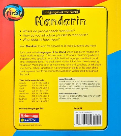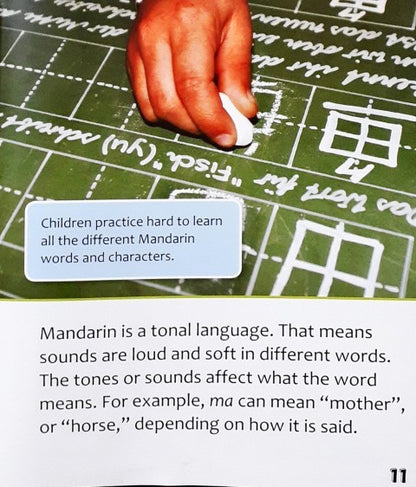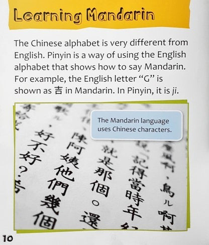 Introduces readers to the Mandarin dialect of Chinese, with information about where it is spoken, who speaks it, and what script it uses, as well as lessons of basic Mandarin phrases.
