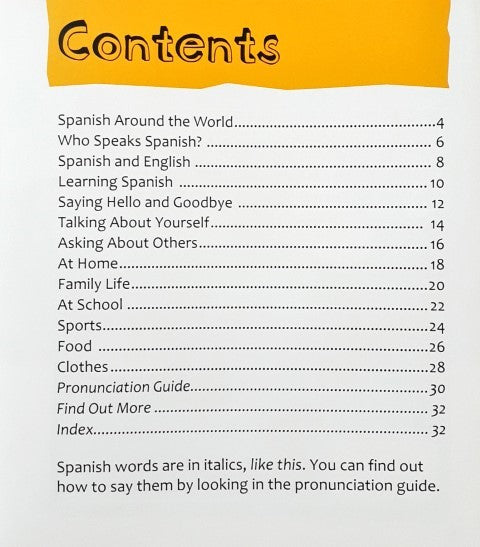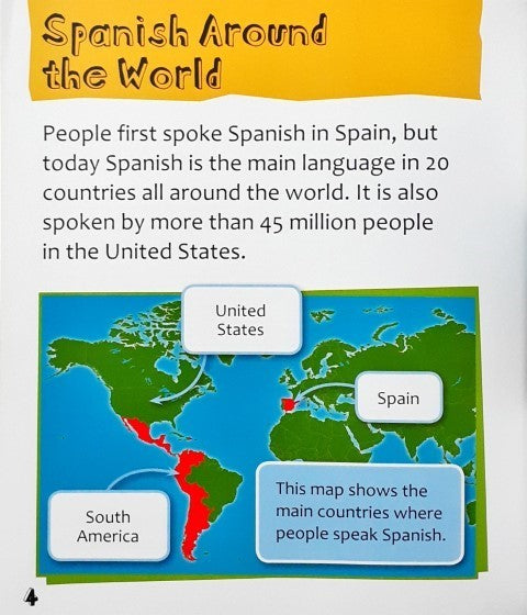 Introduces Spanish, discussing who speaks it and where, describing the similarities and differences between it and English, and offering some basic vocabulary.