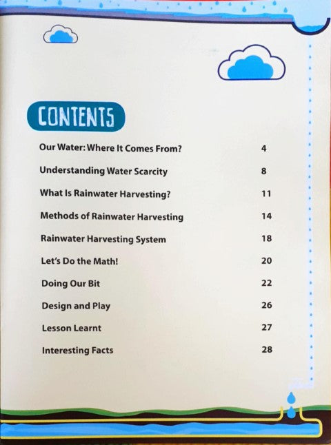 Our Water: Where It Comes From? • Understanding Water Scarcity • What Is Rainwater Harvesting? • Methods of Rainwater Harvesting • Rainwater Harvesting System • Let’s Do the Math! • Doing Our Bit • Design and Play • Lesson Learnt • Interesting Facts- Details
