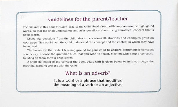 This pictorial book simplifies concepts and helps the child imbibe them in the process of reading. Every grammatical concept has been made self explanatory by the words highlighted for easy understanding. The colourful and simple illustrations involving animals and children make these books engaging and fun.