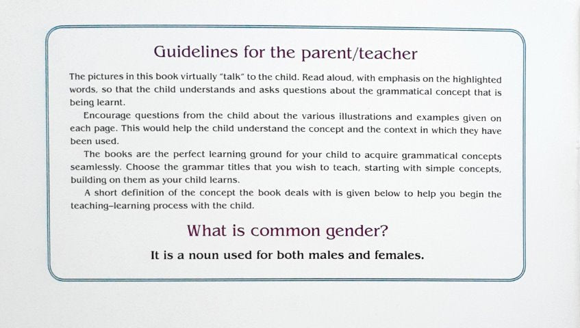 This pictorial book simplifies concepts and helps the child imbibe them in the process of reading. Every grammatical concept has been made self explanatory by the words highlighted for easy understanding. The colourful and simple illustrations involving animals and children make these books engaging and fun.
