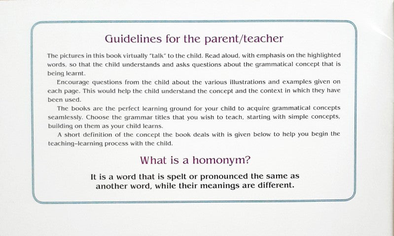 This pictorial book simplifies concepts and helps the child imbibe them in the process of reading. Every grammatical concept has been made self explanatory by the words highlighted for easy understanding. The colourful and simple illustrations involving animals and children make these books engaging and fun.