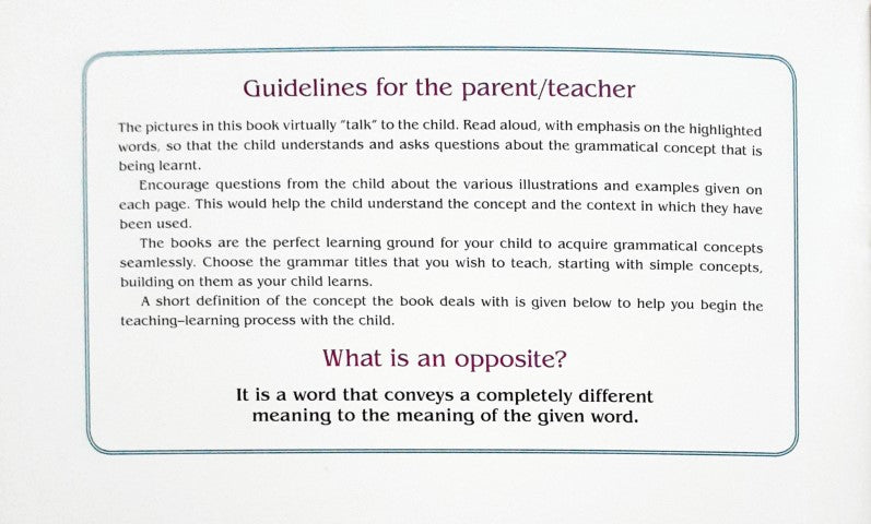 This pictorial book simplifies concepts and helps the child imbibe them in the process of reading. Every grammatical concept has been made self explanatory by the words highlighted for easy understanding. The colourful and simple illustrations involving animals and children make these books engaging and fun.