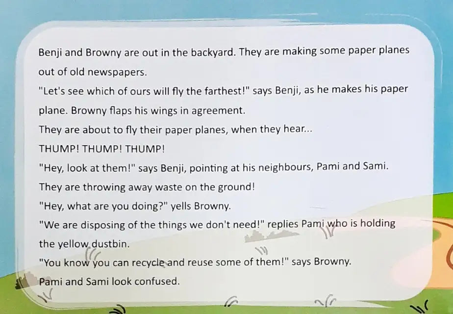 Benji and Browny are playing in their backyard when they see their neighbours, Pami and Sami, putting all the garbage together. They decide to help their neighbours with disposing of garbage. Read to find out how they help?