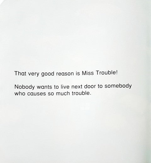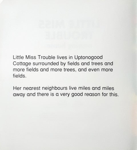 No one wants to live next door to mischievous Little Miss Trouble. But is having neighbours to play tricks on quite as much fun as Little Miss Trouble thin Living solo may sound like a blast - if you can evade the real-life repercussions of her shenanigans! (But who can resist)?