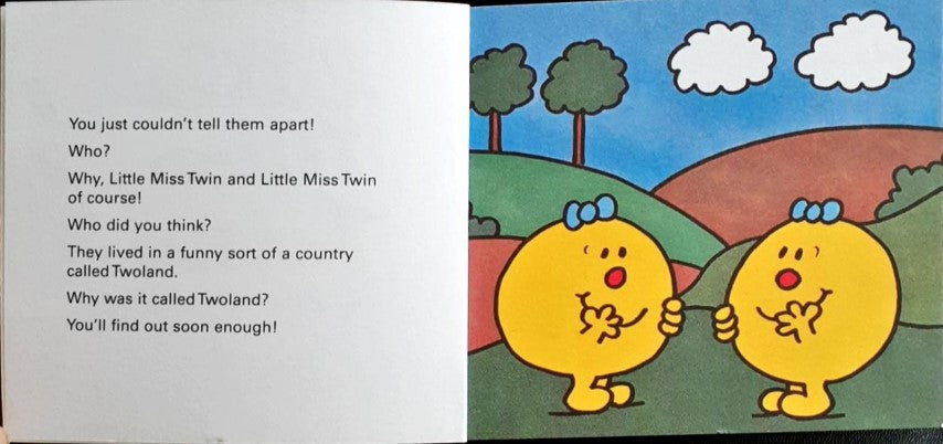 Mr. Nosey travels to Twoland, a place where two of a kind is the norm, and quickly meets two times the charm, Little Miss Twin and Little Miss Twin.