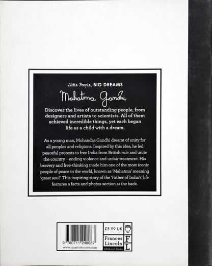 As a young teenager in India, Gandhi led a rebellious life and went against his parents' values. But as a young man, he started to form beliefs of his own that harked back to the Hindu principles of his childhood. Gandhi began to dream of unity for all peoples and religions. Inspired by this idea, he led peaceful protests to free India from British rule and unite the countryβending violence and unfair treatment. His bravery and free-thinking made him one of the most iconic people of peace in the world, known as 'Mahatma' meaning 'great soul'.