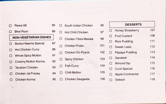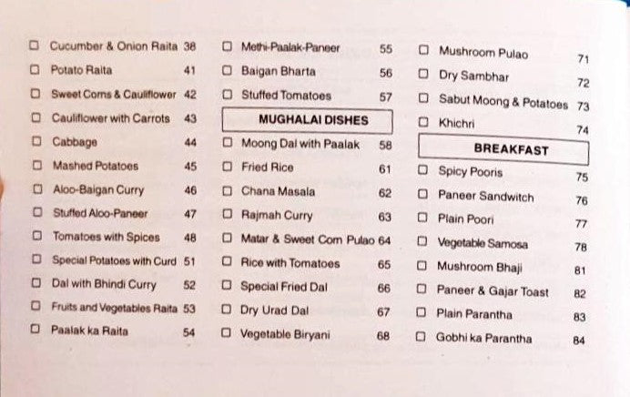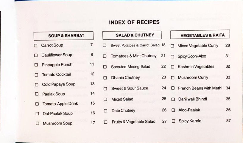 Collection of 90 party recipes with colourful illustrations of the dishes. Includes Soups & Sharbat, Salads & Chutneys, Vegetable Curries & Raita, Mughalai Dishes, Breakfast recipes, Non Vegetarian dishes and Desserts