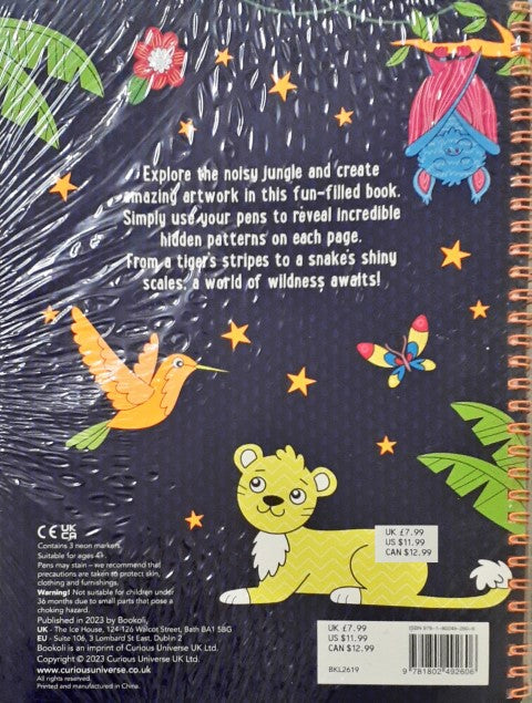 Unleash your creativity with the included neon pens, specially designed to reveal incredible hidden patterns on each page. From a tiger's majestic stripes to a snake's glistening scales, the jungle's secrets come to life as you color.