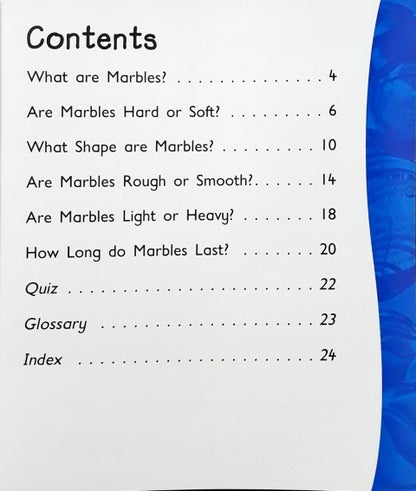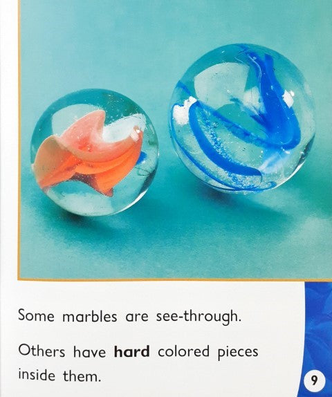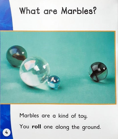 Describes what marbles are, explains why they are round and smooth, and compares them to other round objects.
