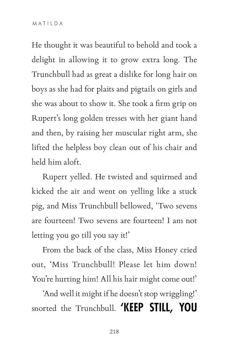She warms up with some practical jokes aimed at her hapless parents, but the true test comes when she rallies in defense of her teacher, the sweet Miss Honey, against the diabolical Trunchbull. There is never any doubt that Matilda will carry the day. Even so, this wonderful story is far from predictable. Roald Dahl, while keeping the plot moving imaginatively, also has an unerring ear for emotional truth. The reader cares about Matilda because in addition to all her other gifts, she has real feelings.