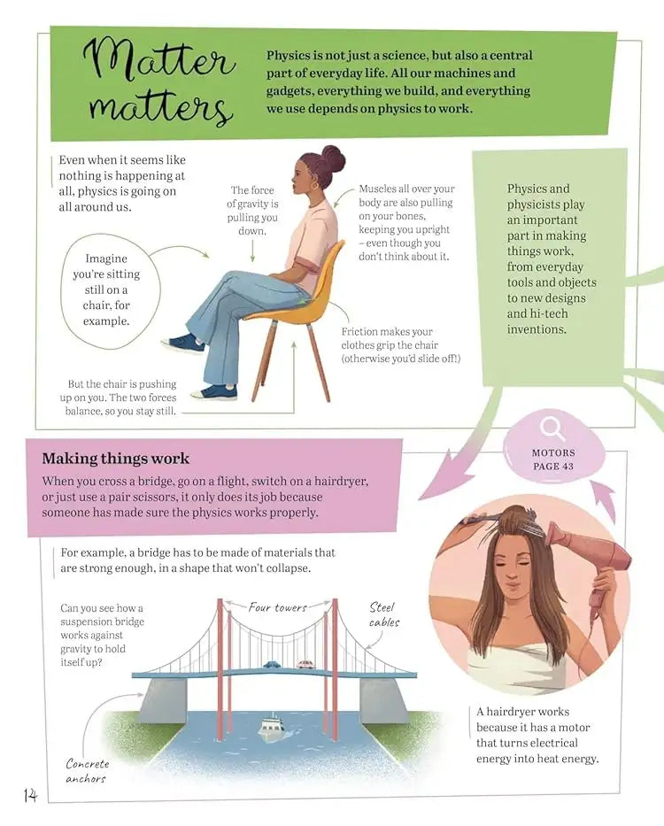 mind maps physics for kids, Anna Claybourne physics book, physics book ages 8+, interactive science book for children, STEM learning physics kids, physics concepts explained for kids, visual learning science book, Anna Kuptsova illustrator, full-colour physics encyclopedia, children’s physics reference India
