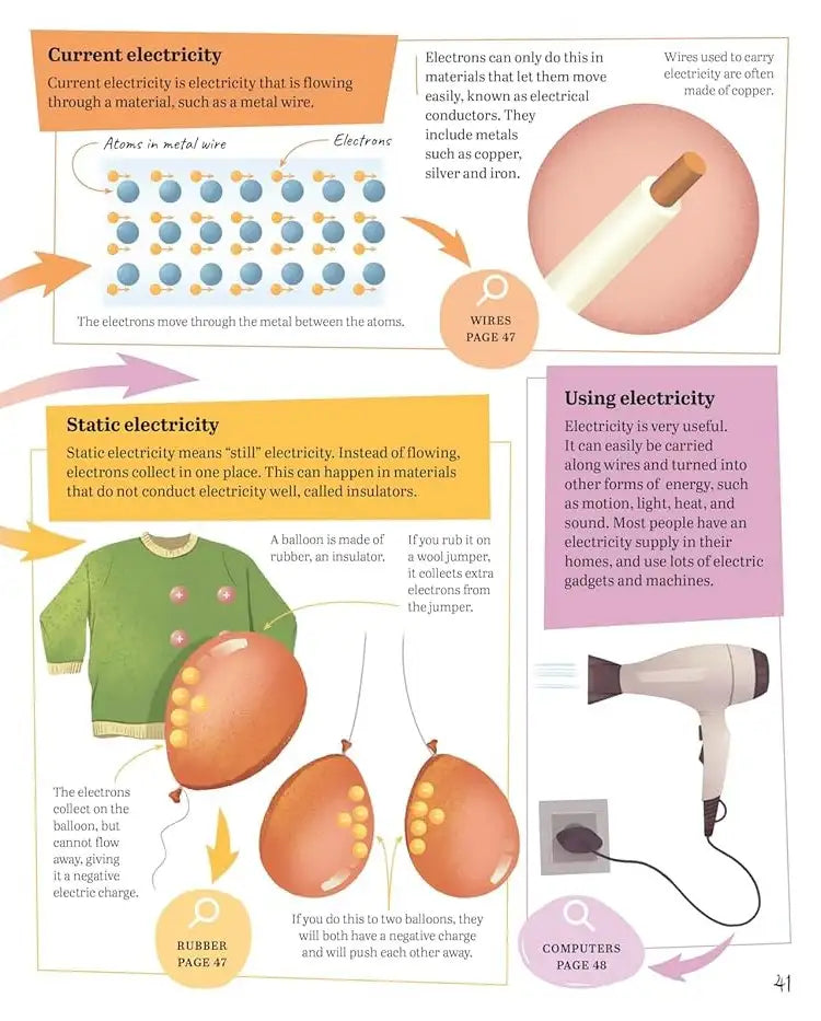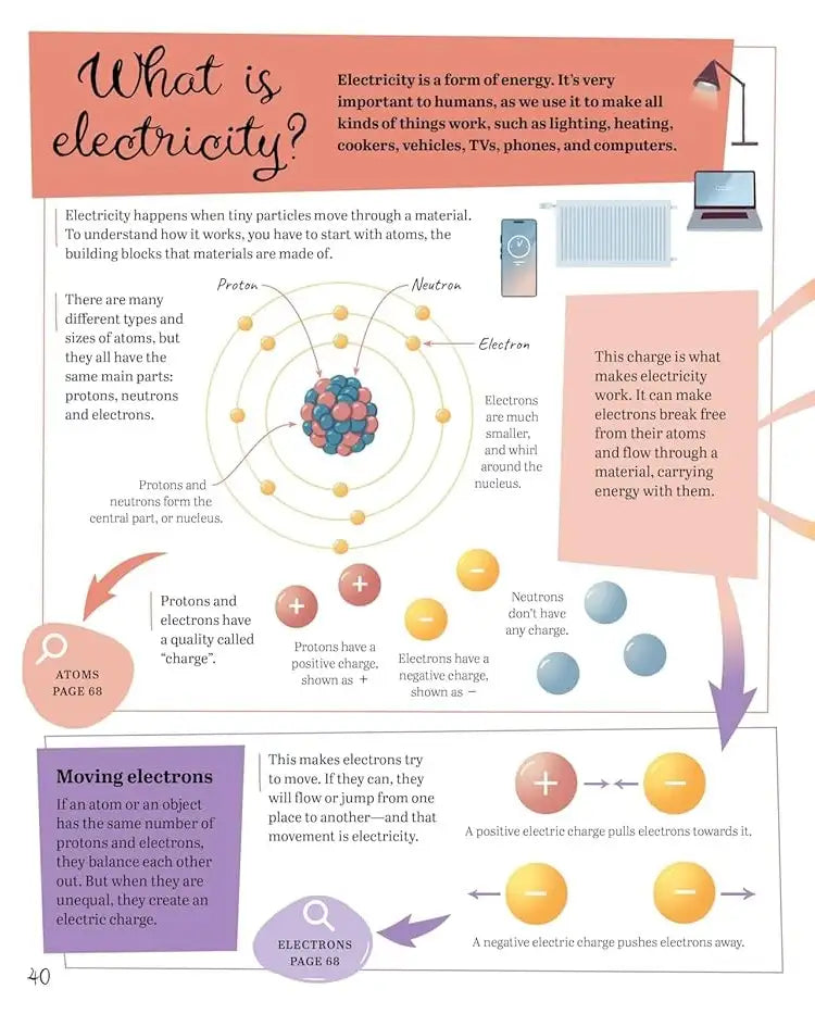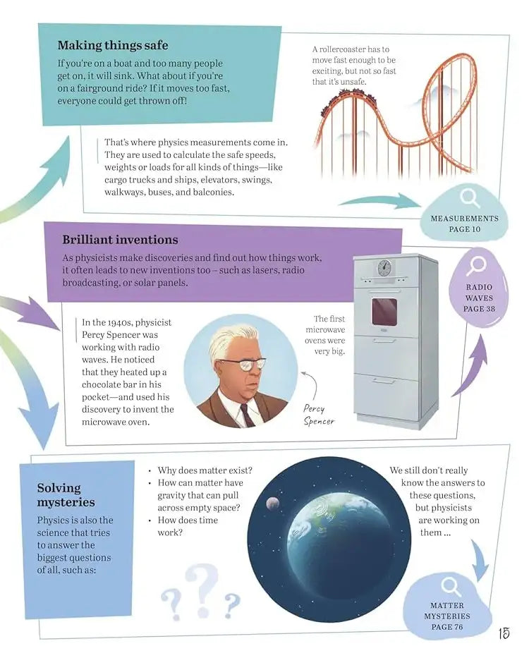 Instead of reading in straight lines, children can jump between related topics, following arrows, pathways and connections that mirror how real scientific ideas intertwine. Whether they start at black holes, gravity, light, energy, relativity or technology, every page opens up new discoveries.