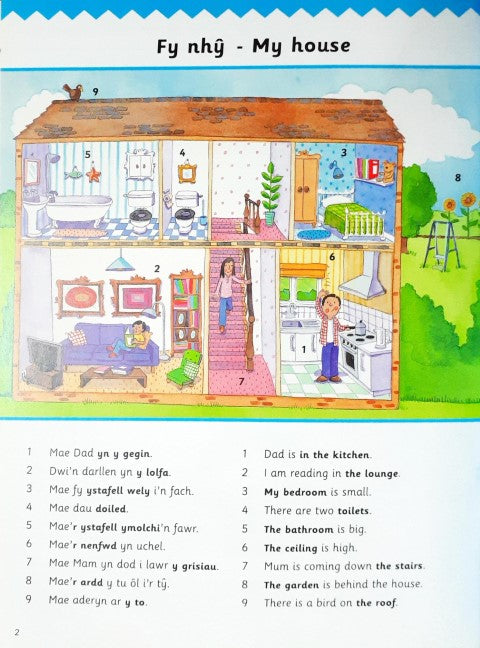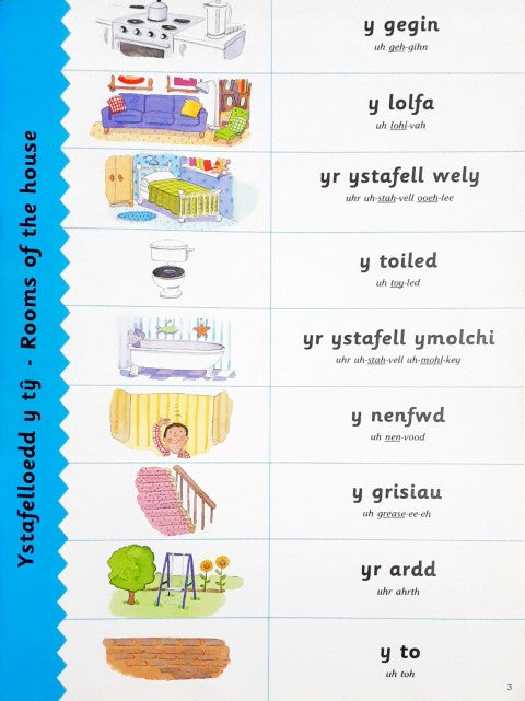 An interactive picture word book. It goes further than most picture word books. It offers an effective and simple way to learn over 130 key Welsh words following the tried and tested method of look, cover and speak. Using the two wipe clean flaps at the back of the book to cover the words or the pictures, you can practise speaking or writing the words as many times as you want. The is organised into 15 popular themes including days of the week, sports, shopping and asking questions. Each theme contains 9 key words and picture prompts, an easy guide to pronouncing the key words, simple phrases using the key words, a humorous full colour picture illustrating each theme. An enjoyable and practical way to learn the first essential words in Welsh.