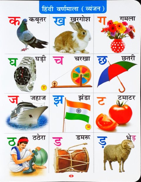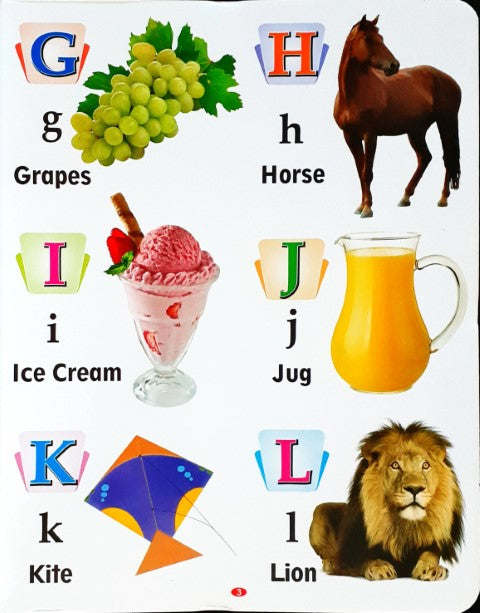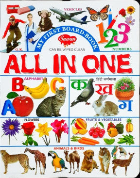 This board book contains alphabets, Hindi Alphabets, numbers 1-10, colours, shapes, flowers, fruits, vegetables, vehicles, wild animals, domestic animals, insects, reptiles & amphibians, birds, sea creatures, parts of the body, good habits, our helpers, festivals, computer parts & peripherals, action words, seasons, calendar & time, stationery, religion & places of worship, national symbols, our currency, moral stories & nursery rhymes