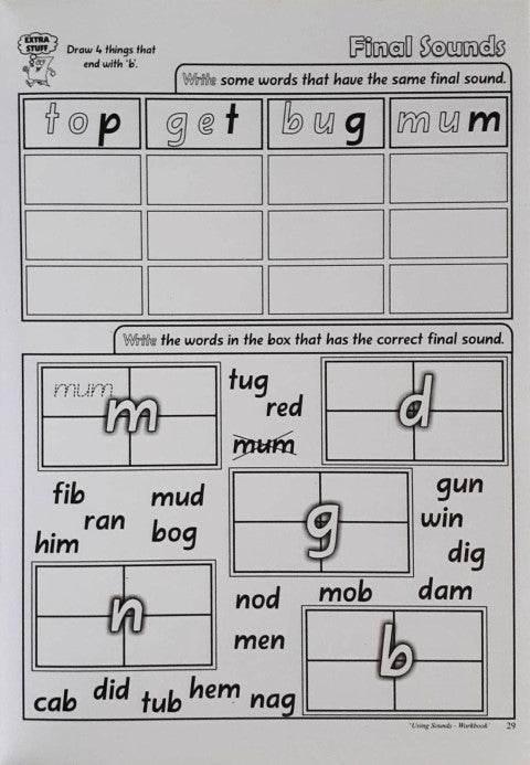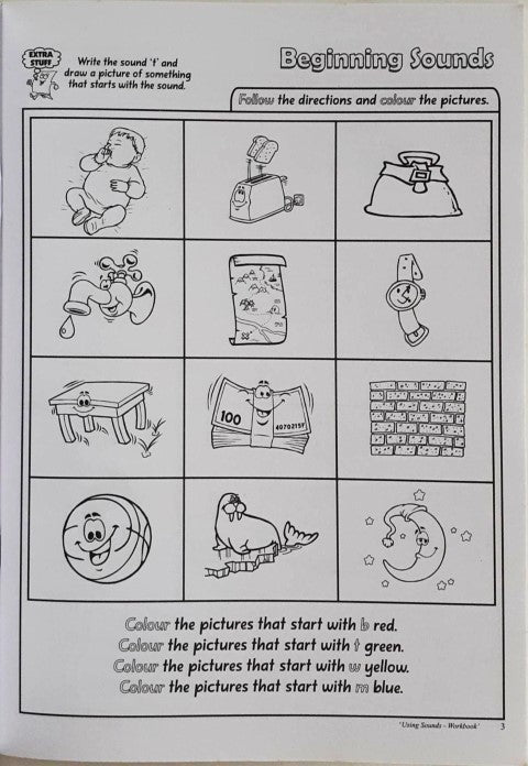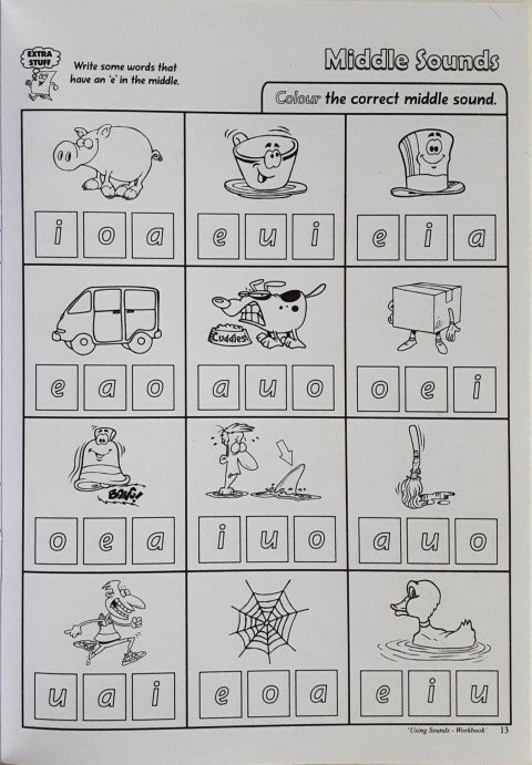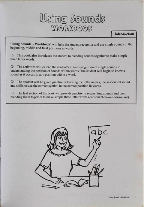 Using Sounds Workbook will provide activities for the student to recognize and use single sounds in the beginning, middle and final positions in words. The student will also be introduced to blending sounds together to make simple three letter words that contain a consonant vowel consonant combination. The ability to segment, blend and isolate sounds in words, in any position is essential to the development of decoding skills