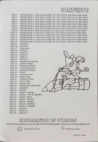 This book includes word searches containing these group of words - Spelling Word Lists, Antonyms, Synonyms, Homonyms, Prefixes & Suffixes, Masculine & Feminine, Adults & Babies, Portmanteau Words, Compound Words, Plurals, Common & Proper Nounds, Collective Nouns, Action Verbs, Saying Verbs, Thinking & Feeling Verbs, Adjectives, Adverbs, Themes - Animals, Themes - Fruits & Vegetables, Themes - Space, Themes - The Sea, Themes - Weather, Themes - Buildings, Themes - Transport. Answers included