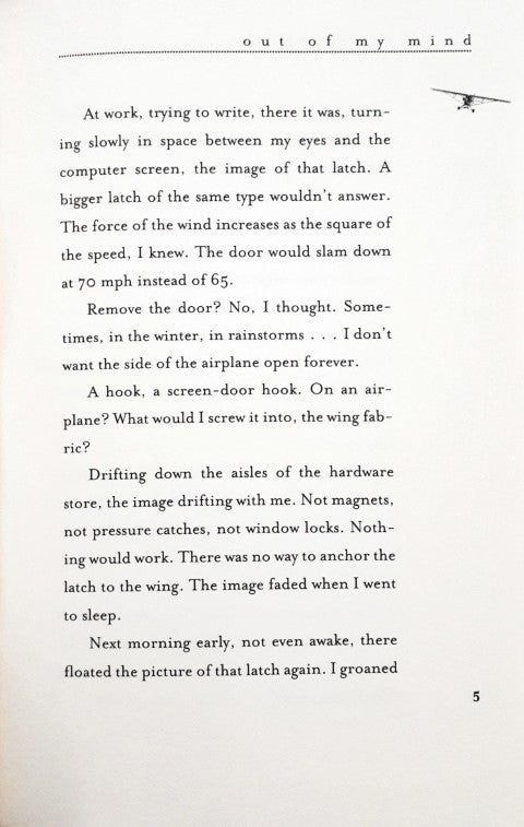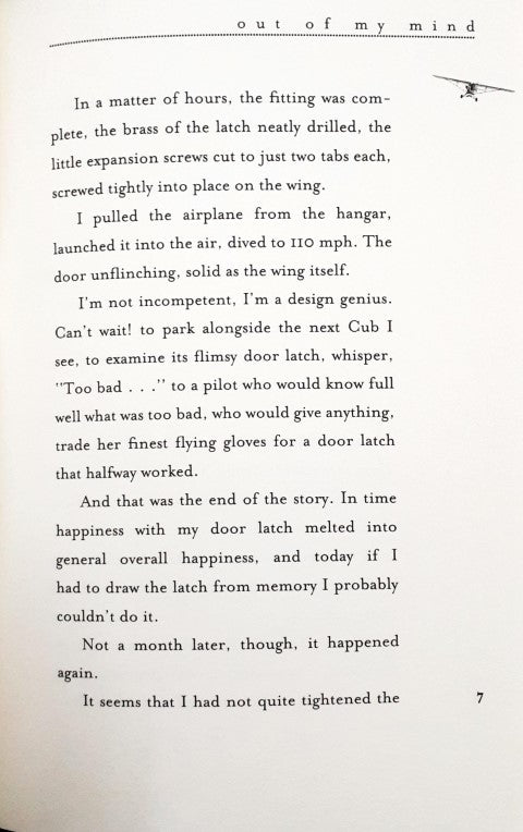 Out of My Mind shows what happens when Richard Bach sets out to solve the design problems troubling his Piper Cub. He is taken on a journey back to 1923 and the creative heyday of British airplane manufacturer Saunders-Vixen Aircraft Company. Out of My Mind is an invitation to discover for ourselves a universe of astonishing possibilities.