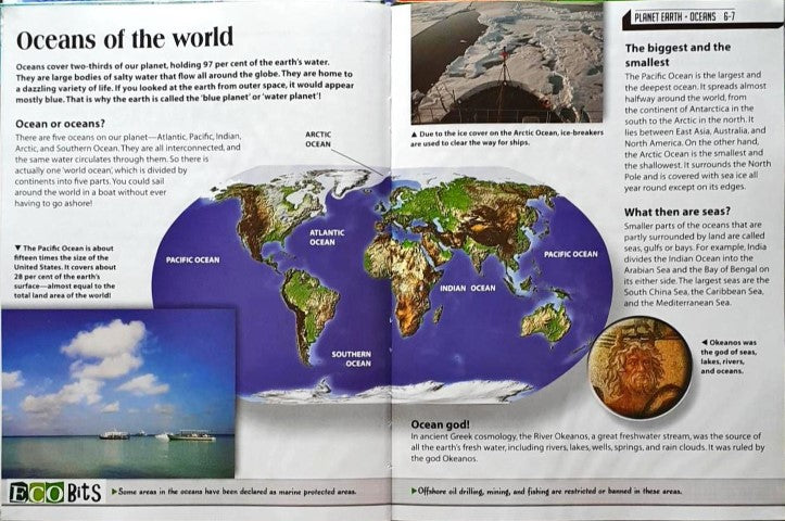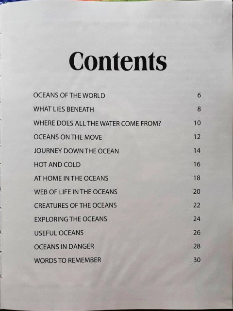 Oceans cover two-thirds of our planet, holding 97 per cent of the earth s water. But oceans are much more than vast expanses of water. Beneath the deep waters lie mountains and volcanoes. Oceans are teeming with life both plants and animals. Explore the oceans of the world and learn how they remain full of water, how they influence the climate, the web of life they support, and the dangers posed by pollution and climate change.