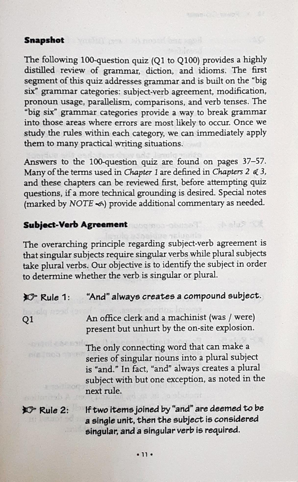 - Grammar - A 100 question quiz focuses on the most useful areas of the six major grammar groups - subject verb agreement, pronoun usage, modification, parallelism, comparisons and verb tenses.