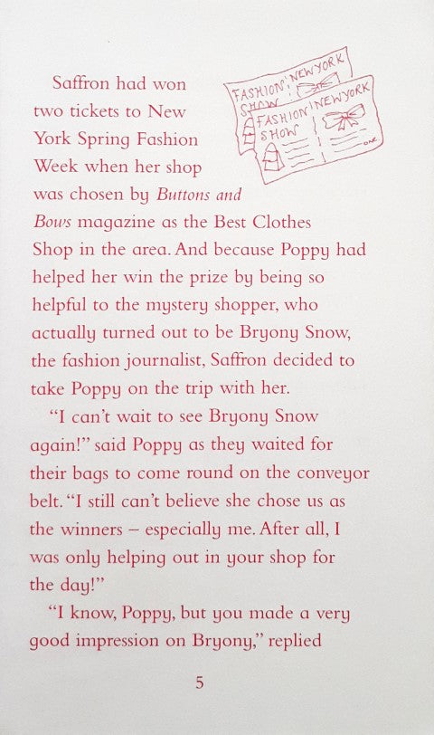 Readers are taken on a thrilling journey to New York City during Fashion Week. Poppy and her grown-up cousin Saffron are in the city to celebrate their boutique, Saffron's Sewing Shop, being chosen as the best boutique by Buttons & Bows Magazine. As part of their prize, they get to meet Bryony Snow, the Editor of the magazine.