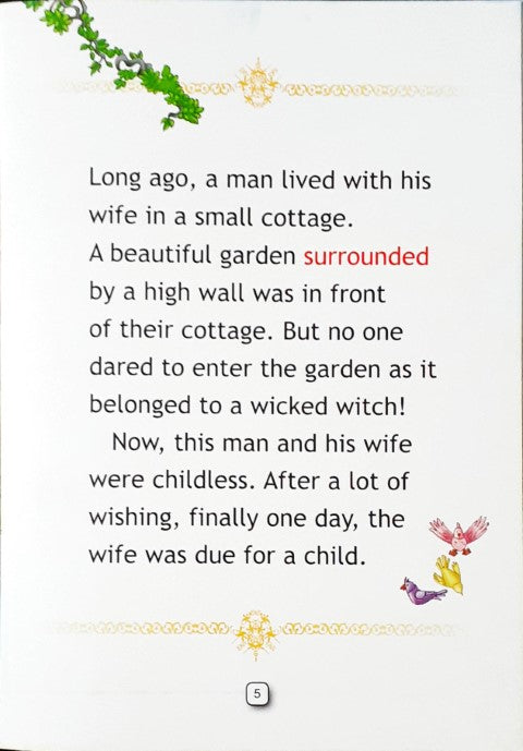 Rapunzel is taken by a witch and kept in a tower. Read about her story in this book. A word bank with difficult words is provided at the end of the book.