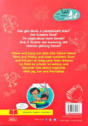 Can you drink a caterpillar's susu? Are flowers food? Do vegetables have bones? And if stripes are slimming, are checks getting fatter? Come and hang out with the Sahils twins - Reva and Prisha and their mothers, Runu and Pritam as they jump from dreams to food to school to walks and discover the world together, with joy, fun and friendship.