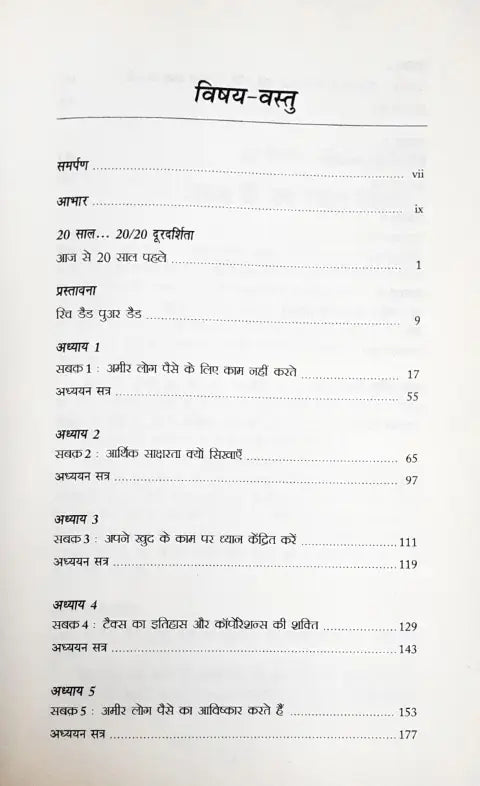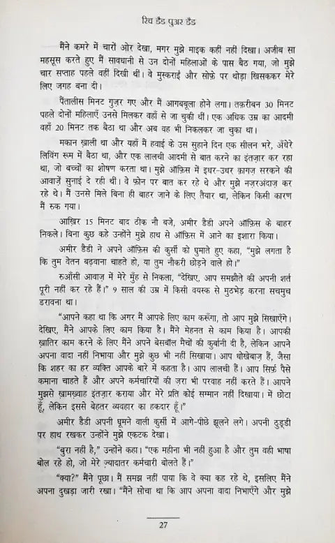 "रिच डैड पुअर डैड" रॉबर्ट की कहानी है जिसमें उनके दो पिता श्रृंगार के तहत शामिल हैं - उनके वास्तविक पिता और उनके सबसे अच्छे दोस्त, उनके धनी पिताजी. यह यह मिथक खंडित करती है कि धन के लिए उच्च आय की एकमात्र राह है, और इसमें धन के लिए काम करने और अपने पैसे को आपके लिए काम करने के बीच अंतर को महत्वपूर्णता देती है। इसके 20वें सालगिरह संस्करण में, रॉबर्ट 1997 के बाद आर्थिक प्रवृत्तियों पर विचार करते हैं, जिससे उनके धनी पिता के सिद्धांतों की स्थायिता की पुनरावृत्ति होती है। पुस्तक आय, आवास, शिक्षा के बारे में परंपरागत विचारों को चुनौती देती है और संपत्ति और दायित्व को स्पष्ट रूप से परिभाषित करती है। यह समय के साथ स्थायी सफलता के लिए बच्चों को महत्वपूर्ण आर्थिक सिद्धांतों सिखाने के लिए एक शाश्वत मार्गदर्शक रहती है।