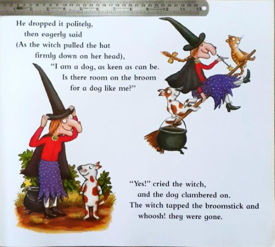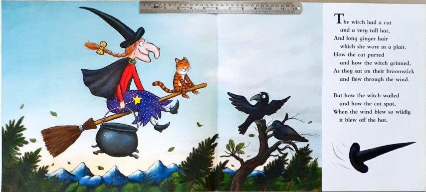 This is a giant size jumbo book. The witch and her cat are happily flying through the sky on a broomstick when the wind picks up and blows away the witch's hat, then her bow, and then her wand! Luckily, three helpful animals find the missing items, and all they want in return is a ride on the broom. But is there room on the broom for so many friends? And when disaster strikes, will they be able to save the witch from a hungry dragon?