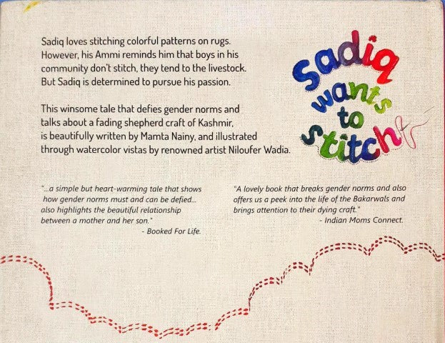Sadiq loves stitching colourful patterns on rugs. However, his Ammi reminds him that boys in his community don't stitch, they tend to the livestock. But Sadiq is determined to pursue his passion. This winsome tale that defies gender norms and talks about a fading shepherd craft of Kashmir, is beautifully written by Mamta Nainy, and illustrated through watercolour vistas by renowned artist Niloufer Wadia.