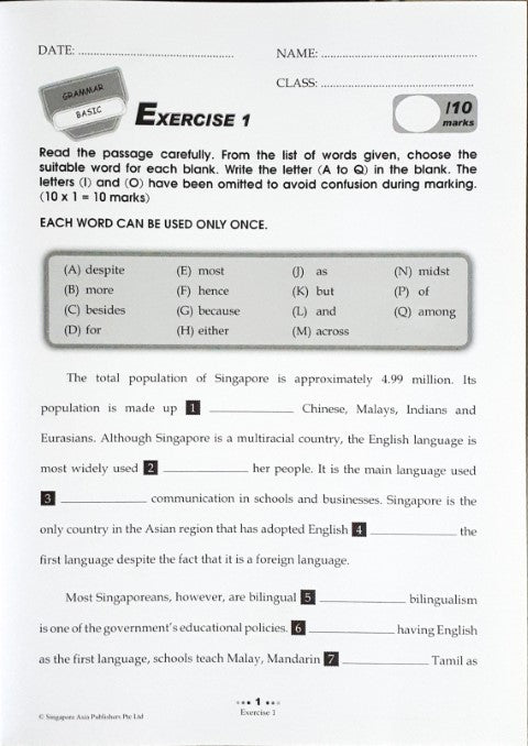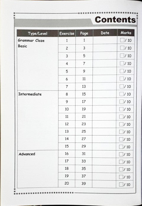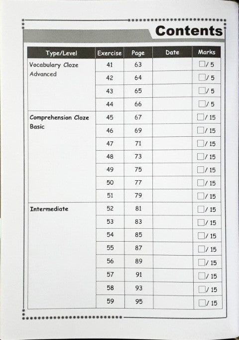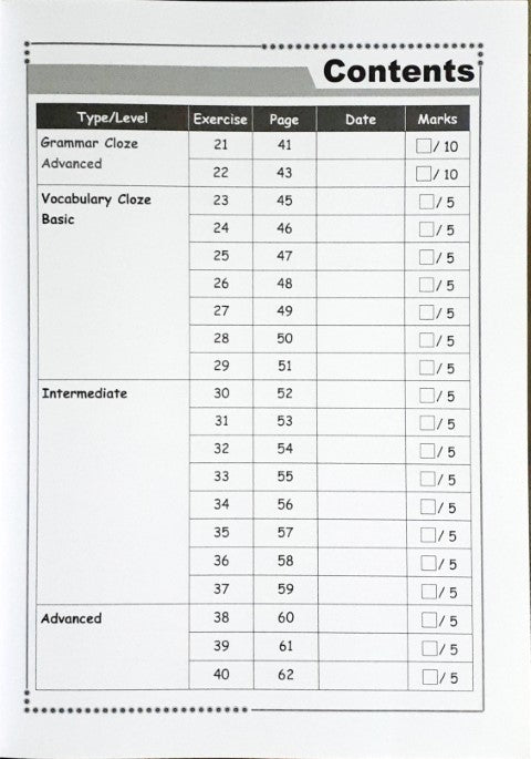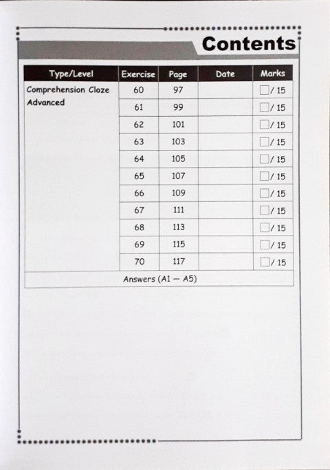 This book is especially designed for Grade 5 students as Cloze test is an important assessment component in all major examinations. There are 70 Cloze tests - 22 Grammar cloze, 22 Vocabulary cloze & 26 Comprehension cloze carefully graded to 3 different levels - Basic, Intermediate and Advanced. It provides interdisciplinary learning through varied text types, interesting themes and topics to encourage reading and pique curiosity and interest in various subject matters. Provides Performance record for quick and easy tracking of student's progress. Perforated, easily removable pages to be used as tests and worksheets for classroom or home learning. It empowers a student's learning and comprehension skills through reading cloze, familiarizes a student with various test formats - Grammar, Vocabulary & Comprehension, provides Progressive exercises to build up a student's confidence, provides varied and interesting text types, provides complete and detailed answers for self assessment.