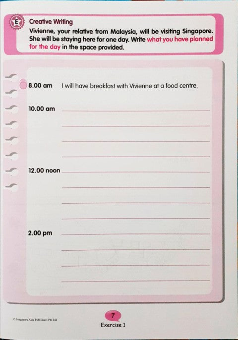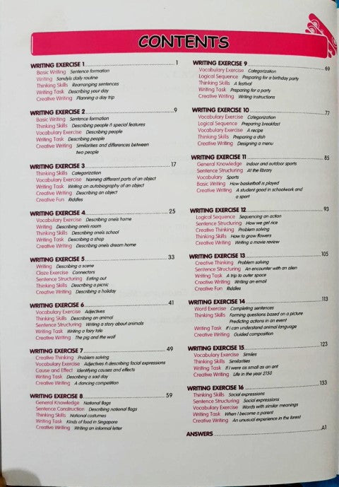 This workbook is especially designed for Grade 3 students. It provides extensive practice for continuous writing, includes tips and techniques to improve introduction, body and ending of a composition, covers a broad range of themes to encourage creativity in writing, provides vocabulary list as a quick reference for synonyms, idioms and similes with comprehensive answers for reference. This workbook invites children to stretch their imagination, enjoy the process of developing ideas and express themselves through creative writing. There are recap exercises on the ways to begin an essay, developing characters and a plot, including interesting details through the use of adjectives and creative phrases, describing vividly a scene and/or a person. Through Guided Continuous Writing Exercises, children learn to interpret a scenario based on a picture. The dialogues among the characters allow the children to imagine what happened before and what would happen after the scene, allowing them to develop the story creatively. The Continuous Writing Exercises present pictures and simple prompts on a composition theme so children can write and expand their own ideas freely. Using the list of synonyms, idioms and similes, children can enhance their vocabulary and make their compositions more interesting. Answers provide alternate ideas so children can learn to relate to other situations and analyze possible outcomes in order to think and write even more creatively.