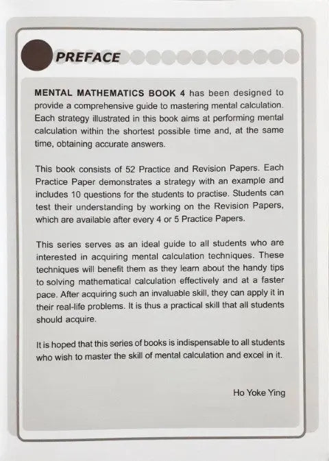 This book has been designed especially for Grade 4 students to provide a comprehensive guide to mastering mental calculation. Each strategy illustrated in this book aims at performing mental calculation within the shortest possible time and at the same time, obtaining accurate answers. This book consists of 52 Practice and Revision Papers. Each Practice Paper demonstrates a strategy with an example and includes 10 questions for the students to practise. Students can test their understanding by working on the Revision Papers which are available after every 4 or 5 Practice Papers. It serves as an ideal guide to all students who are interested in acquiring mental calculation techniques. These techniques will benefit them as they learn about the handy tips to solving mathematical calculation effectively and at a faster pace. After acquiring such an invaluable skill, they can apply it in their real life problems. It is thus a practical skill that all students should acquire.
