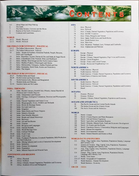 Uses the latest data to make maps with GIS technology in order to provide accurate physical, political and thematic maps. A wide range of detailed, up to date and accurate regional maps of India. Provides the latest available demographic and socio economic data culled from different authentic sources. Maps showing the world heritage sites and cultural heritage of India. Detailed political maps of SAARC countries. World maps showing climate, soil, agriculture and industries. A special map of the World showing natural hazards and biomes at risk. Fully updated and easy to use index for India and the world.