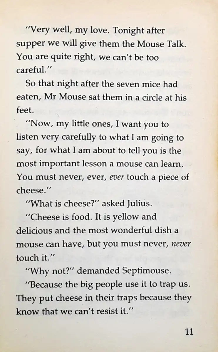 Septimouse is the seventh son of a seventh son and possesses magical qualities. He can talk to cats, to big people, to little people and he can make them as small as mice. But the one thing he mustn't do is eat cheese. By the author of the "Vlad the Drac" series and "Leila's Magical Monster Party".