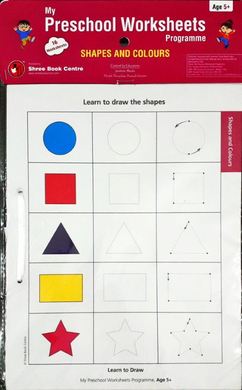 16 Worksheets with multiple exercises to help 5+ year olds to learn Shapes and Colours