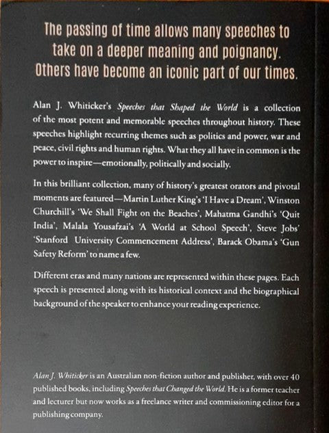 Alan J. Whiticker’s Speeches that Shaped the World is a collection of the most potent and memorable speeches throughout history. These speeches highlight recurring themes such as politics and power, war and peace, civil rights and human rights. What they all have in common is the power to inspire—emotionally, politically and socially.