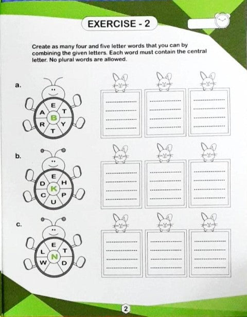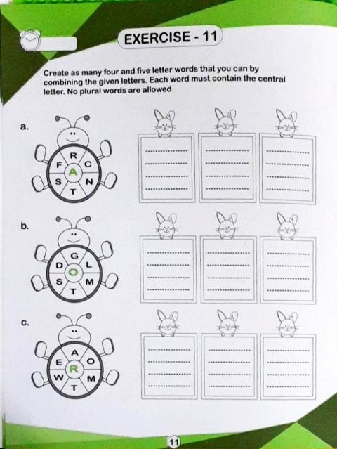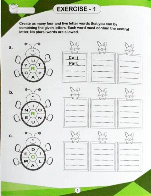 This book has multiple different interesting fun exercises 4 &5 letter words to increase child's vocabulary and word formation skills