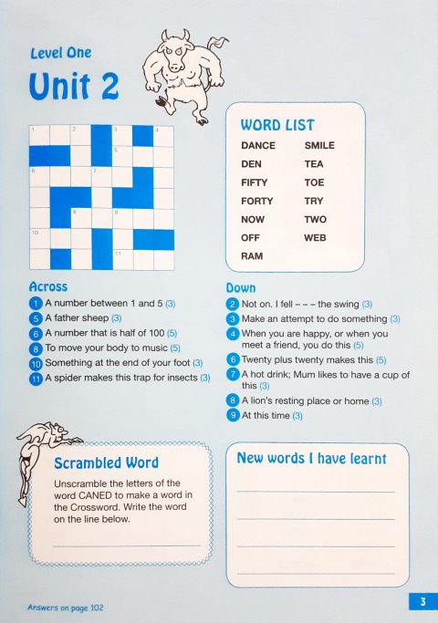 This book provides a challenging and fun way for children to learn spelling, vocabulary, synonyms and grammar. There are a total of 96 crossword puzzles plus extra fun activities for students to complete. A special fun section is also included on every page - Hidden Words or Anagrams and for the early levels, there is a New Words I Have Learnt Section. Answers included