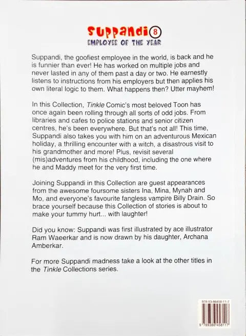 Suppandi is back and he is funnier than ever! Tinkle\'s most beloved Toon has once again been rolling through all sorts of odd jobs in libraries and cafes to police stations and senior citizen centers. But that is not all! This time, Suppandi also takes you with him on an adventurous Mexican holiday, a thrilling encounter with a witch, a disastrous visit to his grandmother, and more! Plus, revisit several (mis)adventures from his childhood, including one where he and Maddy meet for the very first time. Joining Suppandi in this Collection are guest appearances from the awesome foursome sisters Ina Mina Mynah Mo, and everyone\'s favourite fangless vampire Billy Drain. So brace yourself because this Collection of stories is about to make your tummy hurt... with laughter!