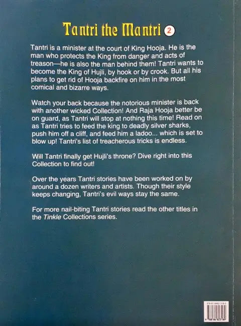 Tinkle's "Tantri The Mantri - 2" by Anant Pai features 25 thrilling tales, and the protagonist - Raja Hooja - is a lovable, naive king with a passion for laddoos. Bunty, the minister, serves him faithfully and has gained the trust of the King. Yet, in secret, he aspires to overthrow Raja Hooja and take the throne. But his schemes repeatedly fail, and in one instance, his attempt to crash the chandelier on the king's head backfires, resulting in it crashing on him instead!