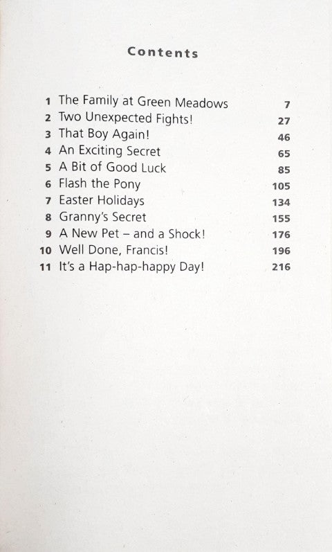 The three children love animals, but haven't any of their own - until they are given a secret to look after. Then other problem pets begin to arrive. Soon Green Meadows turns into an animal home, and Francis, Clare and Sam are having adventures more exciting than they thought possible.
