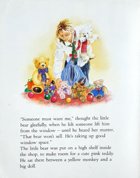 The little polar bear had lived in the toyshop for ages. He sat sadly between a yellow monkey and a beautiful doll, and no one wanted to buy him because he didn’t look like a teddy bear. As Christmas approached, the little polar bear grew hopeful. Surely he would be sold now. But though the yellow monkey and the beautiful doll both found new owners, the little polar bear still sat alone on his high shelf. Would he ever find a child to love him at this very special time of year?