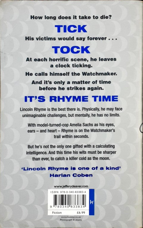 On a freezing December night in New York City, two people are brutally murdered, their deaths marked by eerie, matching calling cards - moon-faced clocks that investigators believe ticked away their last moments on earth. Renowned criminologist Lincoln Rhyme immediately identifies the clock distributor and realizes that the killer, known as the Watchmaker, has more murders planned for the night. As a quadriplegic confined to his wheelchair, Rhyme relies on his trusted partner and longtime love Amelia Sachs to be his eyes and ears on the street. However, Sachs is also juggling her first assignment as lead detective on a homicide case, struggling to balance her pursuit of the elusive Watchmaker with her own case. As she delves deeper, she uncovers shocking revelations about the police force that could jeopardize her career, her sense of self, and her relationship with Rhyme. Meanwhile, the Watchmaker continues to stalk his victims, planning a diabolical criminal masterwork that may be the most cunning