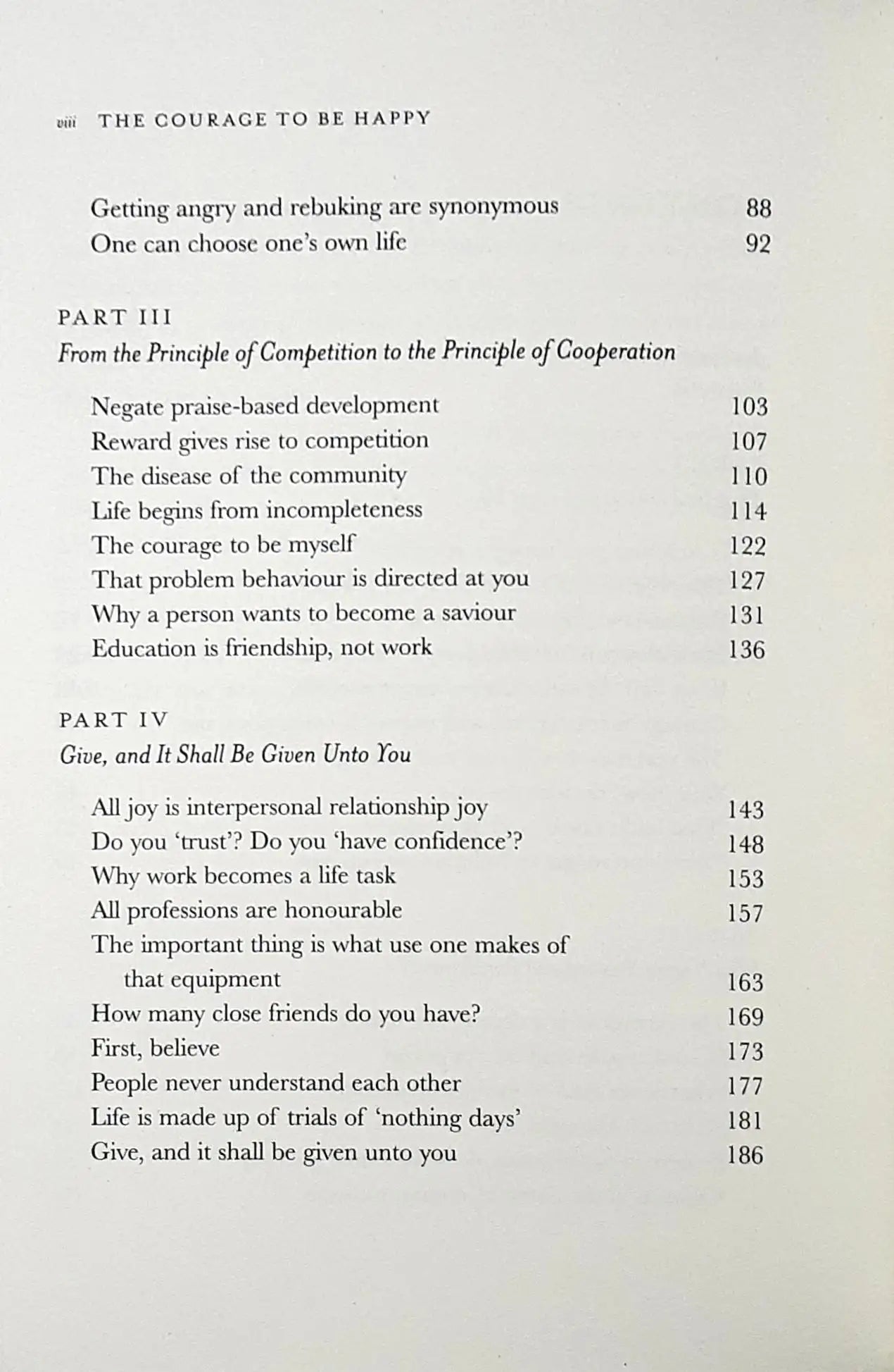 Using a dialogue-based format, similar to its predecessor, The Courage to Be Happy delves deeper into the philosophies of Alfred Adler, a 20th-century psychologist whose work emphasized the importance of personal responsibility, social interest, and the pursuit of happiness. Through a conversation between a philosopher and a young person, the book encourages readers to examine their beliefs, behaviors, and societal influences that may hinder their happiness.