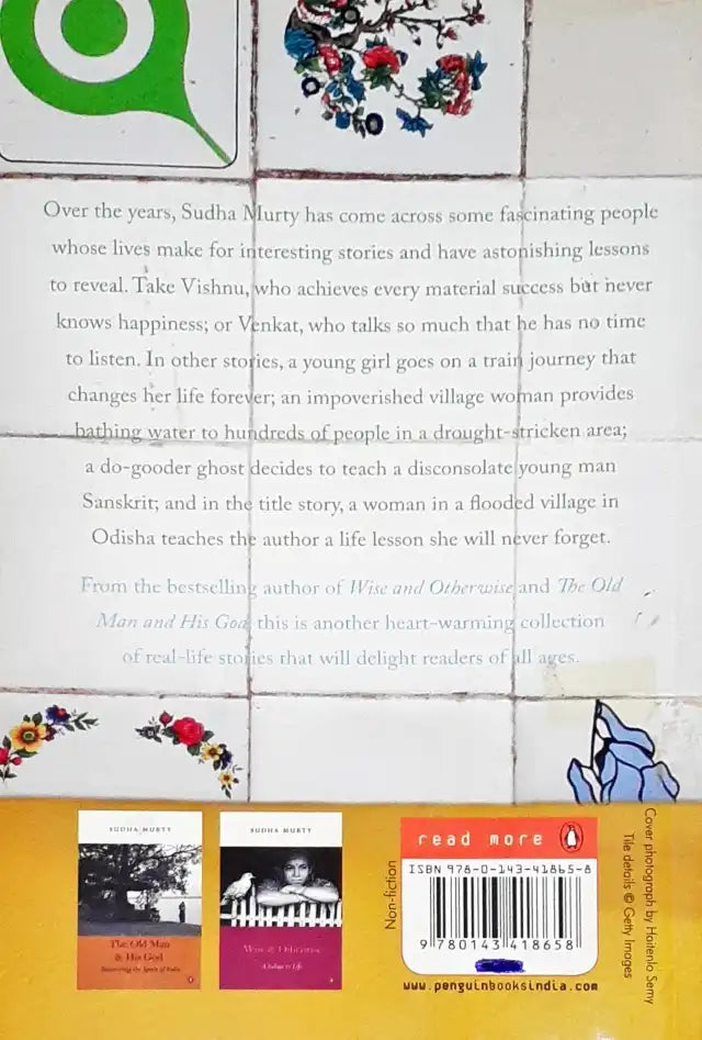 Over the years, Sudha Murthy has come across some fascinating people whose lives make for interesting stories and have astonishing lessons to reveal. Take Vishnu, who achieves every material success but never knows happiness; or Venkat, who talks so much that he has no time to listen. In other stories, a young girl goes on a train journey that changes her life forever; an impoverished village woman provides bathing water to hundreds of people in a drought-stricken area; a do-gooder ghost decides to teach a disconsolate young man Sanskrit; and in the title story, a woman in a flooded village in Odisha teaches the author a life lesson she will never forget.Β Book writtenΒ by Sudha Murthy