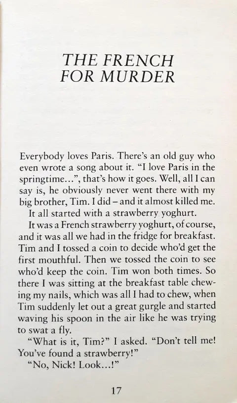 Tim Diamond, renowned for being the most inept detective on the planet, is about to face his greatest challenges yet. In these two perplexing mysteries, his nerves will be pushed to their limits. How in the world is strawberry yogurt connected to Paris? And why on earth have Tim and his younger sibling Nick received an invitation to a secluded Scottish island? Brace yourselves – the answer lies in murder! With danger lurking, the Diamond Brothers must tread cautiously, or they could find themselves as the next victims.