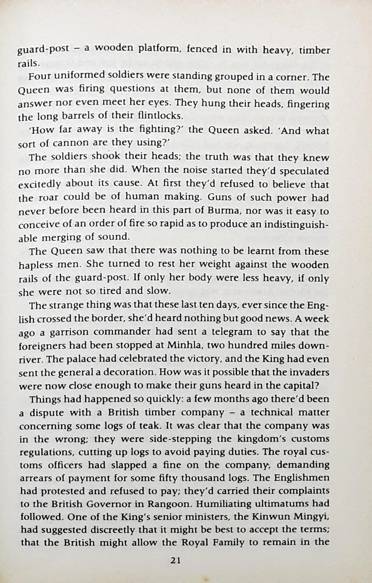 Set against a backdrop of political upheaval, The Glass Palace weaves a tale of the complex relationships between the Burmese, Indians, and British. Among its vivid characters is Miss Dolly, a court lady whom Rajkumar marries, and the formidable Jonakin, part of the British-educated Indian community who oversees the exiled Burmese court.